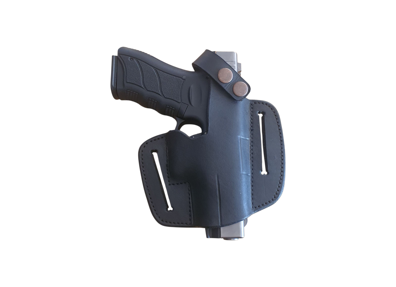 Multi Compatible Genuine Leather Holsters suitable for right hand carry or Left Hand Carry OWB compatible with a wide range of Large size firearms similar in size to Baretta 92, 1911, Glock 19, CZ75B & P07 and more within similar size and builds. This version is of a Black leather with no metal clip which webs around the belt for front, side or rear carry.