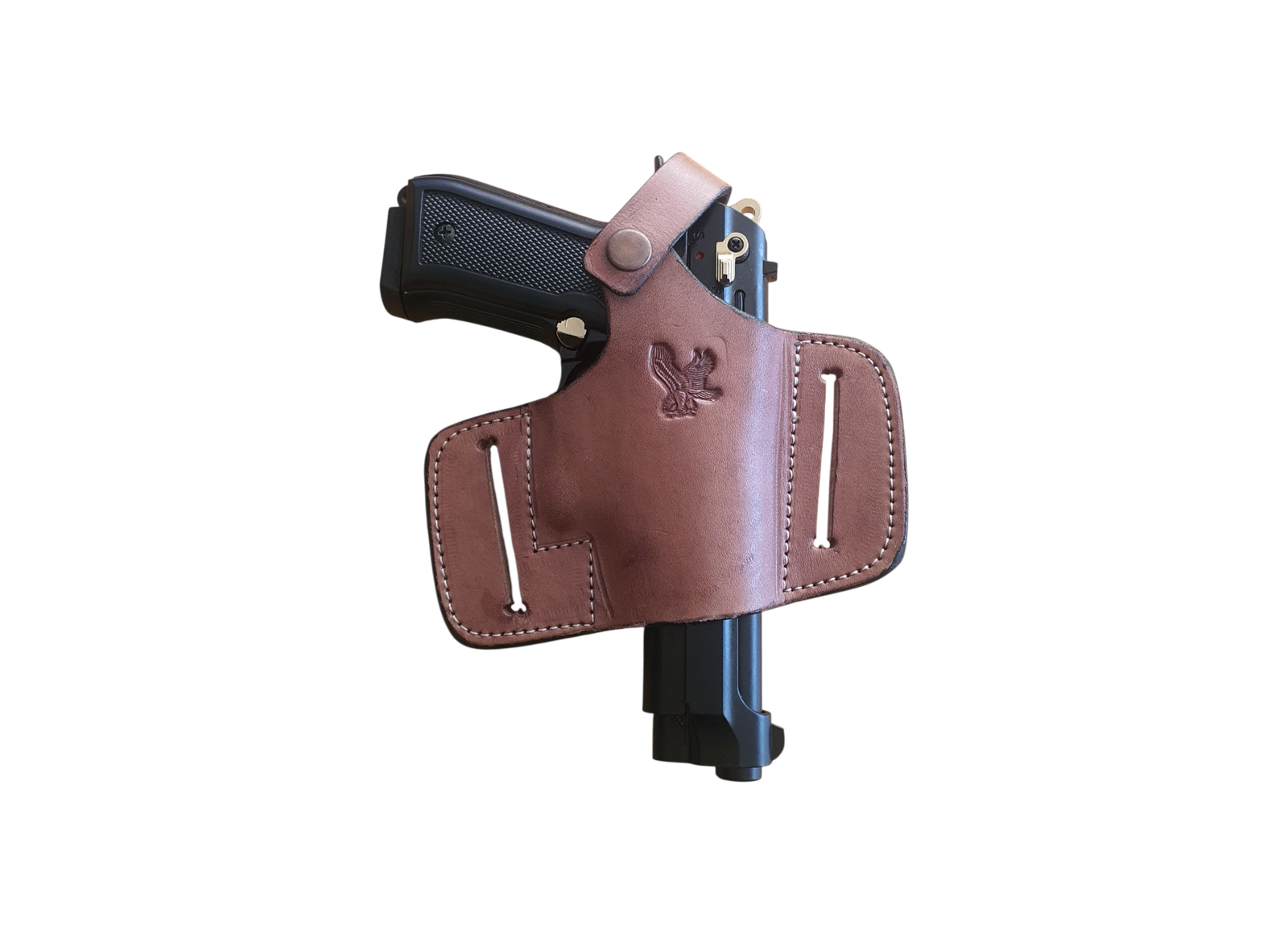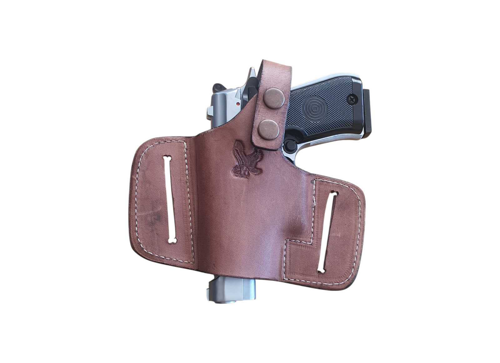 Multi Compatible Genuine Leather Holsters suitable for right hand carry or Left Hand Carry OWB compatible with a wide range of firearms similar in size to Baretta 92, Baretta 84fs, 1911, Glock 19, CZ75B & P07 and more within similar size and builds. This version is of a brown leather with no metal clip which webs around the belt for front, side or rear carry. Includes 2 size adjustable clip for both large or medium size pistols.