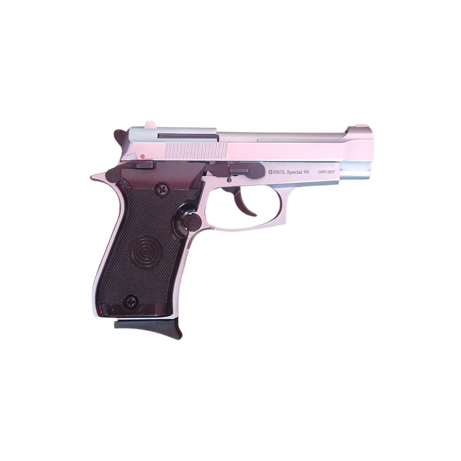 The Ekol Special 99 blank/pepper gun is a compact, versatile self-defence tool designed for both personal protection and realistic training scenarios. This semi-automatic pistol mimics the look and feel of a traditional firearm, offering an authentic experience without the use of live ammunition.