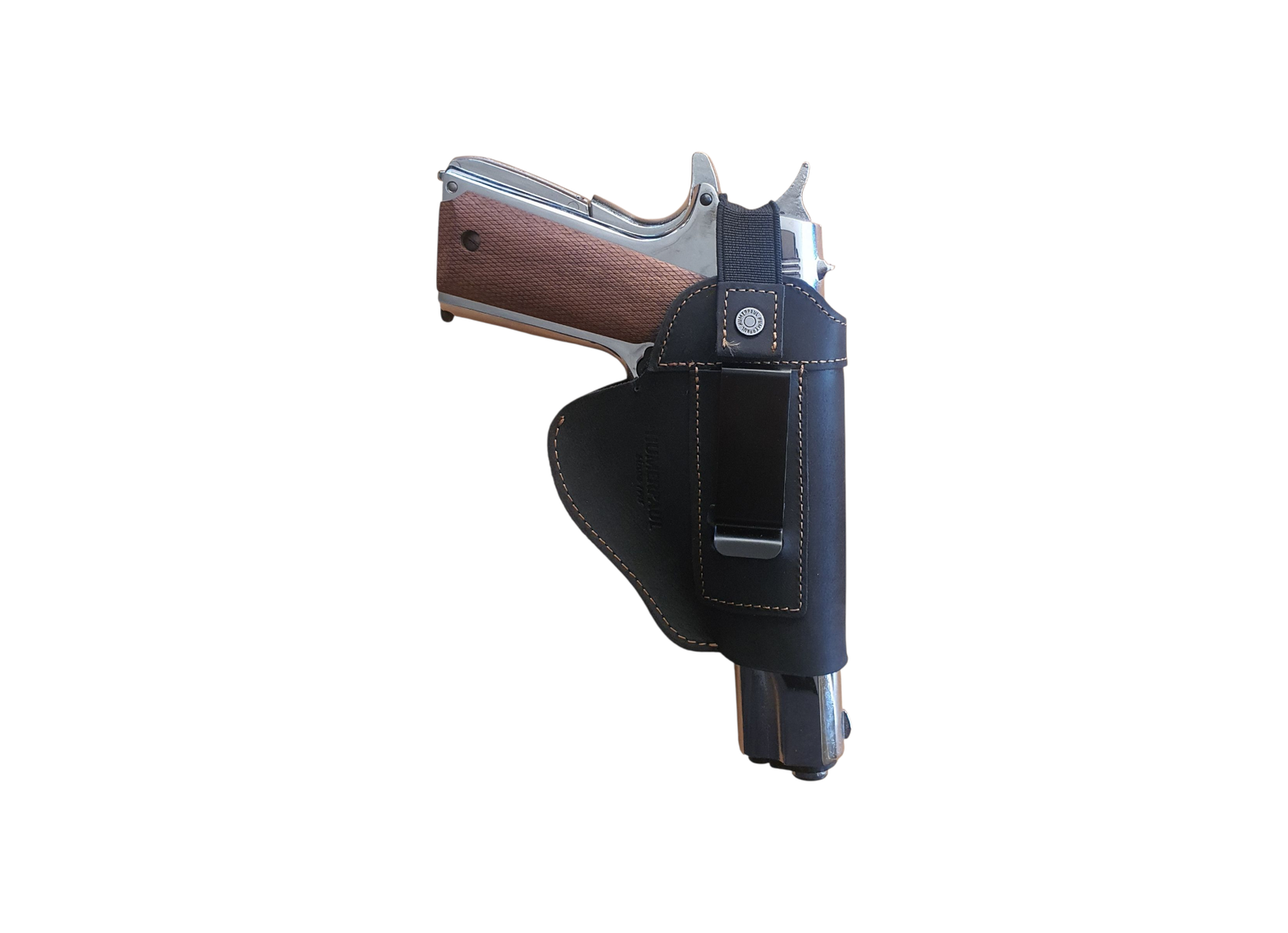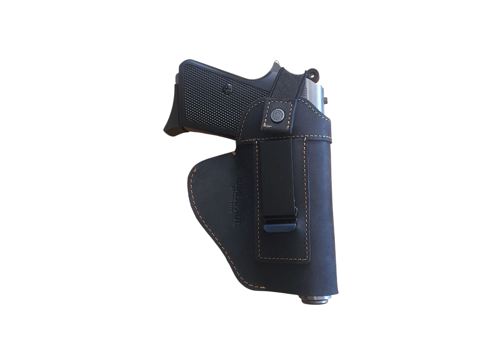 Leather belt holster for all size pistols ranging from baby brownings to large size pistols such as barettas, cz and more. includes a removable metal clip which can be worn IWB or OWB both left or right handed carry.