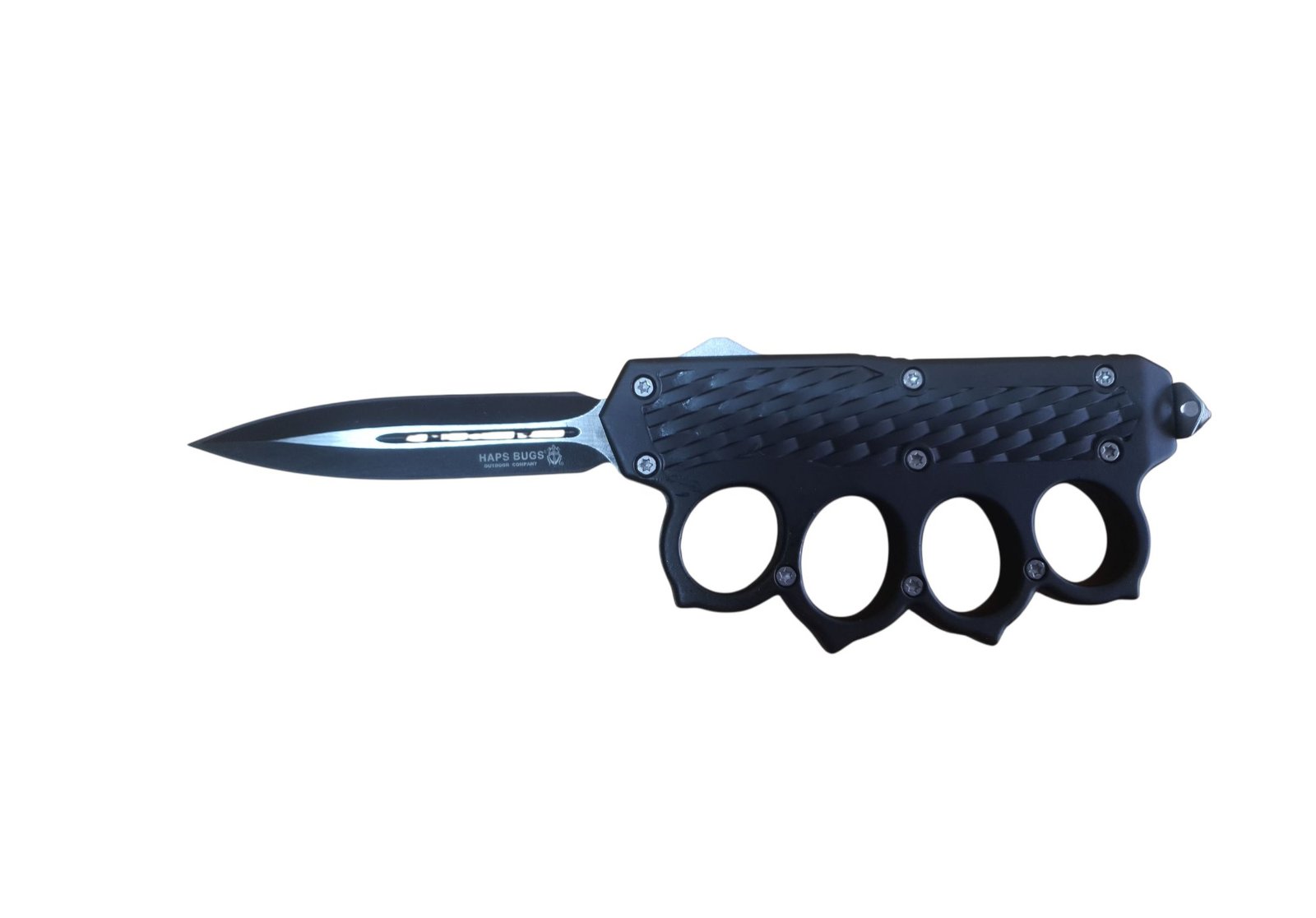 This out-the-front trench knife is crafted with an aluminum alloy body that has a black matte rubberized finish. Even with the tacky non-slip coating, the palm section still has a textured grip for even more control. The knuckle guard has wide 1.25-inch ovals that will fit most hands, and is topped with studded spikes. This maximizes the effectiveness of defensive strikes, while also making it look that much cooler. The blade comes out and goes back into the housing with the slide of a button located on the side of the handle. Crafted from a very durable and high chromium D2 steel, this 3.5-inch blade has a razor-sharp edge and tanto tip. It seems appropriate that this double action knife would have a dual-toned blade, with half being the polished steel and the other half is anodized black to match the handle. With a few vented holes along the spine, this blade is nimble enough to be ejected from the housing at break-neck speeds.