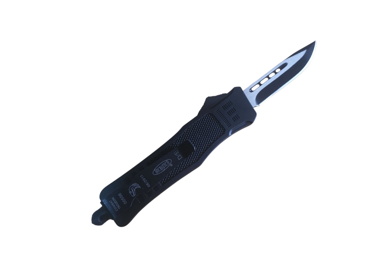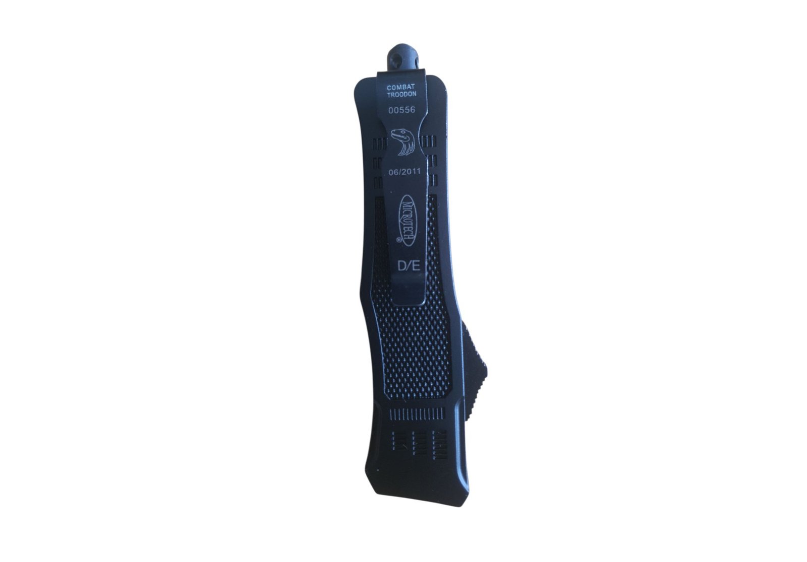 Microtech Combat Troodon Gen 2 features a double-action out-the-front (OTF) mechanism with a thumb slide, a titanium tip-down pocket clip, and can be found in various blade styles and finishes, such as double-edge or tanto, with specific steel and finish options varying by model. Thumb Slide locking mechanism. Titanium, tip-down carry pocket clip.